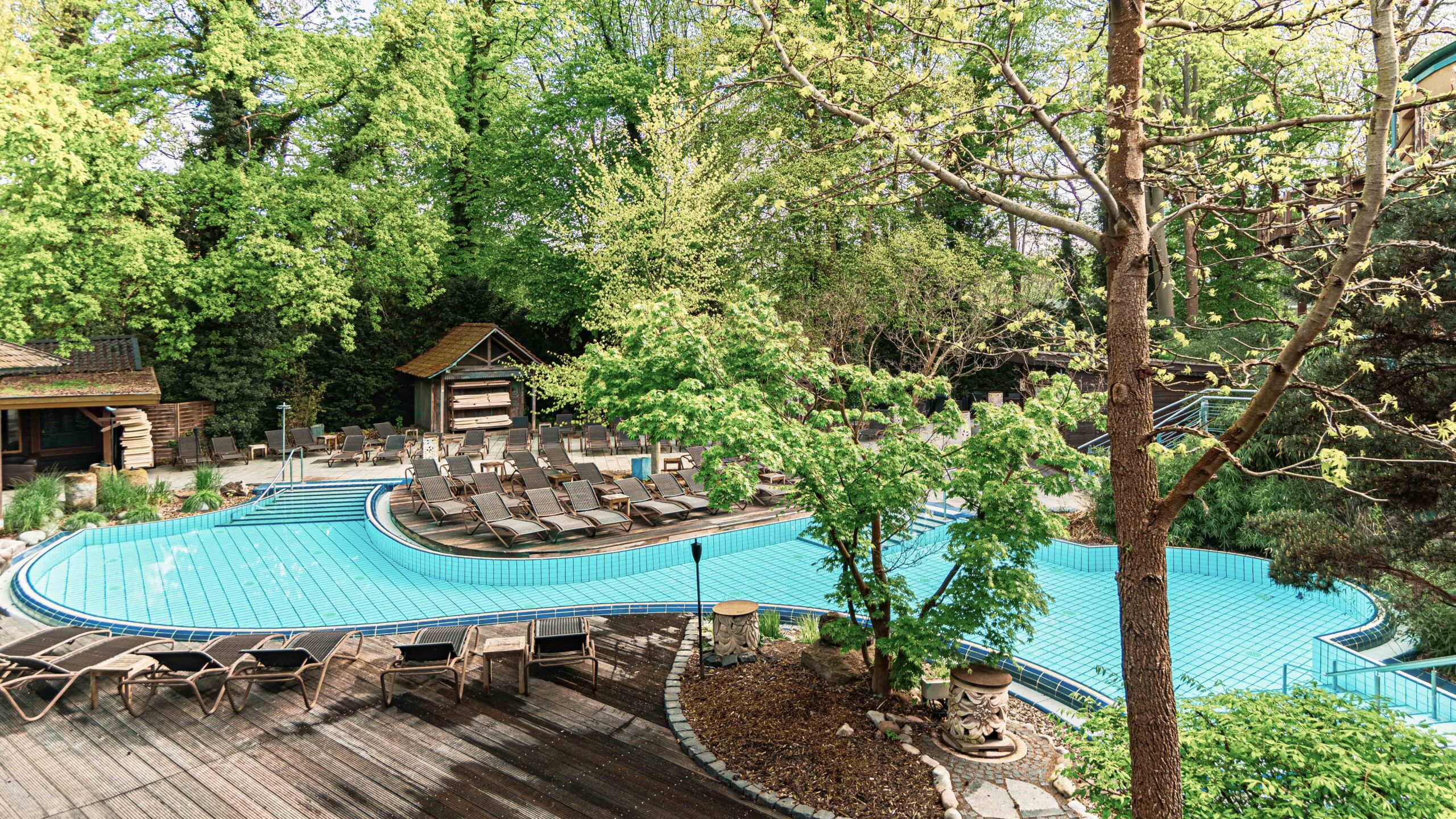 Herzstück der Therme ist die großzügige Wasserlandschaft mit Innen- und Außenbecken, Whirlpools, Wasserfällen und gemütlichen Rückzugsorten. Die Becken sind mit staatlich anerkanntem Thermalwasser gefüllt und laden zum entspannten Treibenlassen oder aktiven Schwimmen ein.