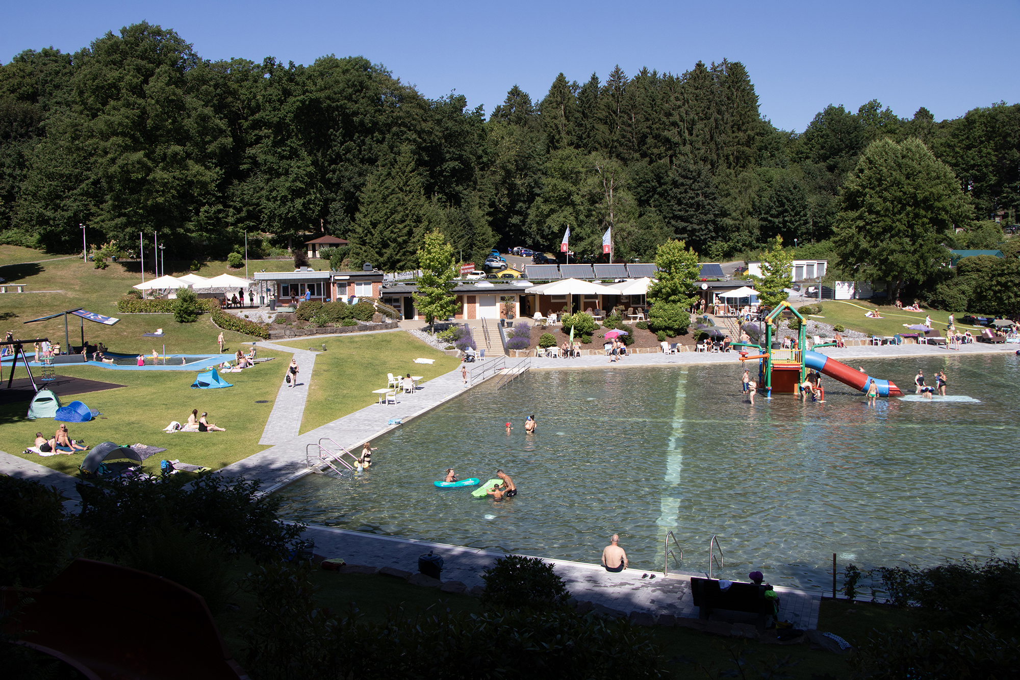 Neu ist die barrierefreie Beckeneinfassung, die einen durchgehenden Zugang bis ins Wasser ermöglicht und das Waldfreibad für alle Besucher – besonders für Familien und Erholungssuchende – noch zugänglicher macht.