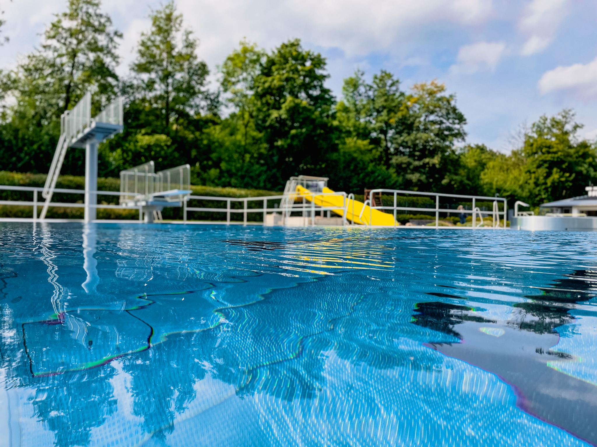 Die große Liegewiese bietet viel Platz zum Sonnenbaden und Entspannen. Schatten finden Besucher unter alten Bäumen oder unter dem Sonnensegel – ein perfekter Ort, um sich nach einem erfrischenden Bad zu erholen.